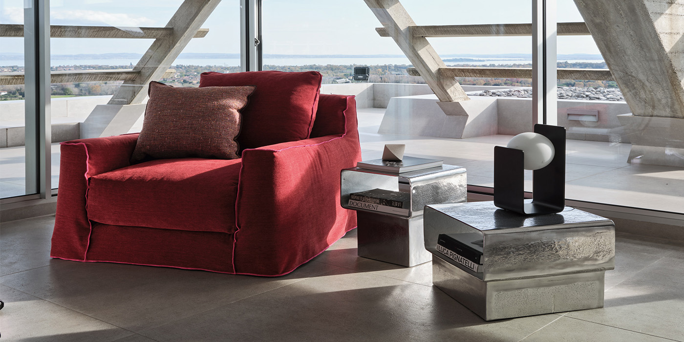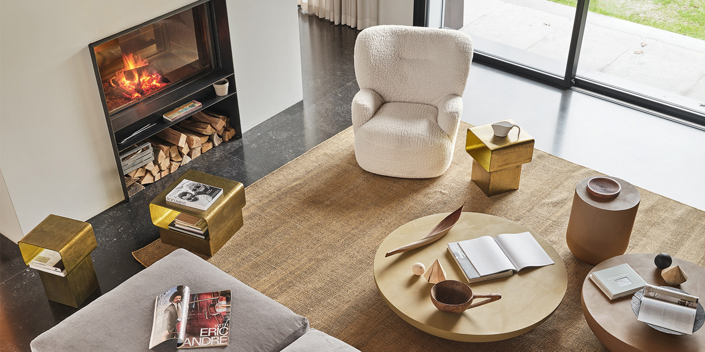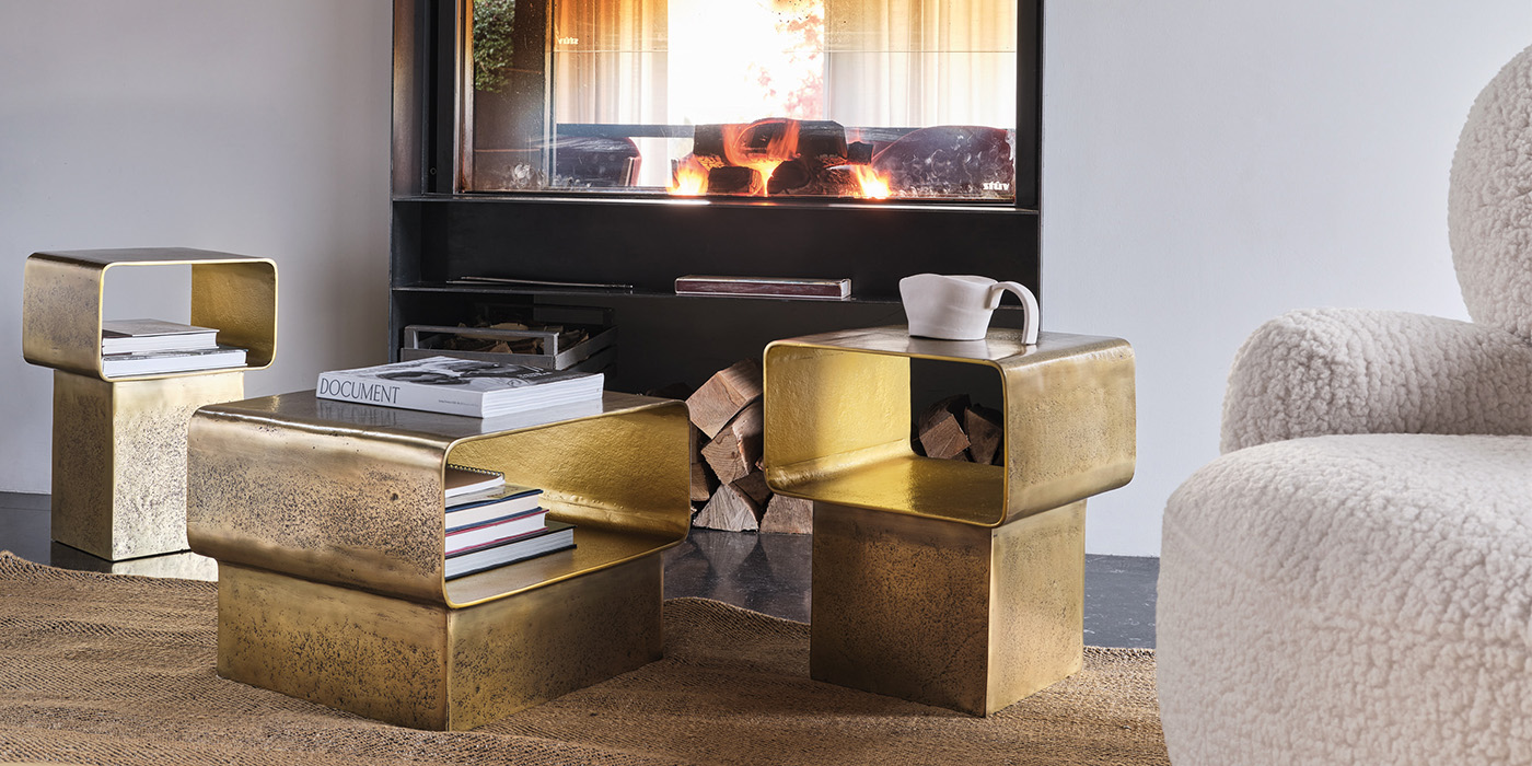 ソリッドと空洞のボリュームが織りなす大胆なデザインが際立つコレクション。その名は、日本語の「きらきら」に由来し、光を受けて輝くようなテクスチャーと美しさを想起させます。鋳造アルミニウムで仕立てられた KIRAは、キュービックなベースと、角に丸みを持たせたスクエア天板による精緻なジオメトリーとクリーンなラインが特徴で、インダストリアルでありながら洗練された佇まいを演出します。